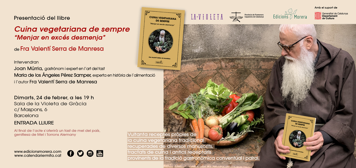 El proper 24 de febrer a les 18.30 h, l’Auditori de La Violeta de Gràcia acollirà la presentació de Cuina vegetariana de sempre (Col·lecció l’Ermità núm. 19) el nou llibre de fra Valentí Serra de Manresa on recupera tot un conjunt de receptes provinents de la cuina vegetariana tradicional i de convent.