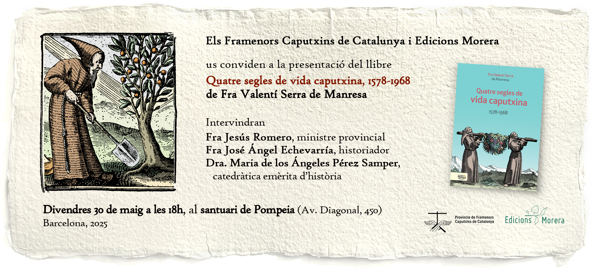El proper divendres 30 de maig, a les 18 hores, es farà la presentació pública de “Quatre segles de vida caputxina. 1578-1968”, un llibre sobre la trajectòria dels caputxins a Catalunya, des de la seva arribada el 1578. El seu autor, fra Valentí Serra, arxiver dels caputxins i historiador, ens parla de la fundació dels primers convents i de la vida espiritual i quotidiana dels framenors, amb un capítol dedicat a les clarisses-caputxines. També relata com la comunitat de caputxins va viure moments històrics tan intensos com la invasió napoleònica o la guerra civil, sense oblidar la destacada acció missionera dels caputxins a ultramar.